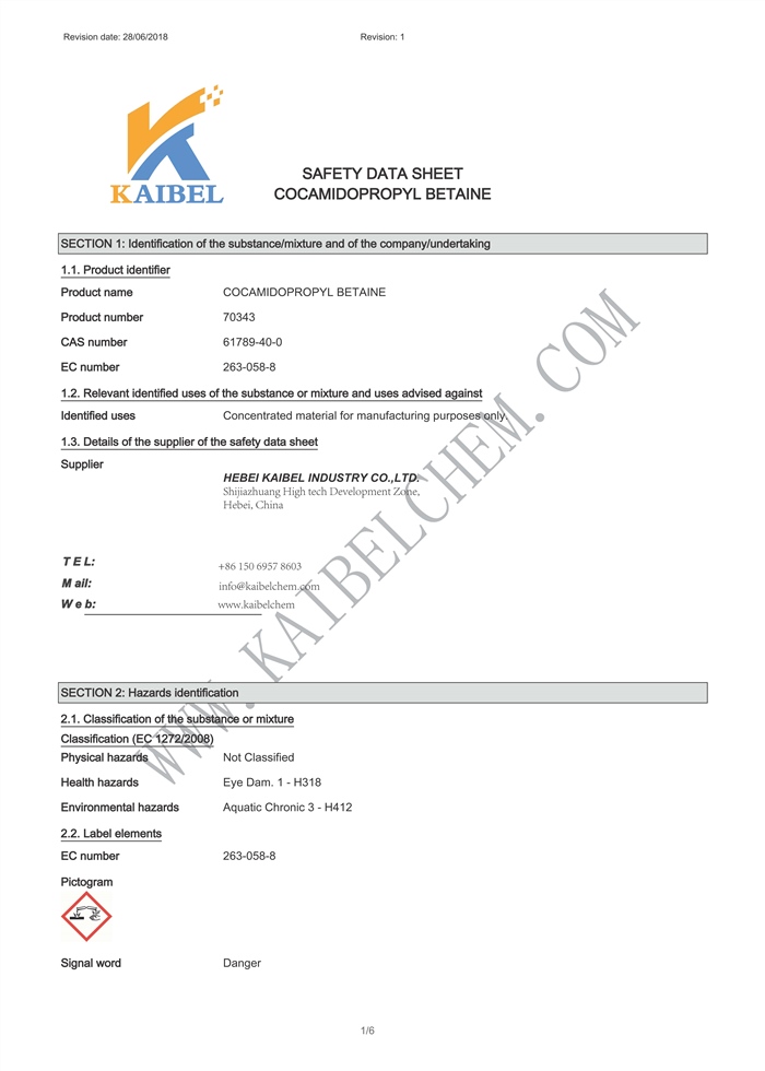 Cocamidopropyl betaine (CAB) is used in many personal care and household products as a surfactant, foam enhancer, and thickening agent.Skin care: As a medium-strength surfactant in bath and body products, removing oil from the skin. It is used as a foam enhancer in body washes and as an emulsifying agent in cosmetics Hair care: It eliminates oil from hair. Cocamidopropyl betaine in shampoos works as a foam booster and creates a rich lather after coming in contact with water. It adds viscosity to hair conditioners and makes them creamier and richer. It also serves as an antistatic agent in hair conditioners